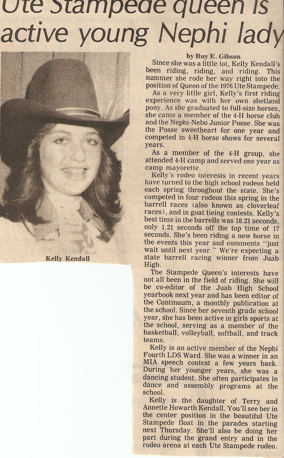 As hundreds were aware, Nephi's 4th of July celebration was as good as it ever was. The first photo shows a prior time when Erma Garrett babysat her grandnephew-Justin Jones. We can now put the Cherry bombs on hold and put our western attire on as the Ute Stampede is returning to Nephi, Utah for its 82nd showdown. I heard this year will be the best ever, but can't find my latest copy of The Times News, so will go with what I got. Indications are the carnival has moved away from the Central School and tennis court and moved to the Juab County Fairgrounds. I also heard that Monte Young's Rides and Shows are no longer around, so just show up to the "City of Fun" and see which carny will spin you the most on the merry-go-round. I am not sure if Kemp Motes is the Grand Marshall of the parade, but if he is, who could be more proper. Same goes for the Stampede Royalty, with a Lunt or a Winn, or is it that Kendall gal Roy Gibson wrote about. One thing I know for sure, I am excited to see which of all of those beautiful gals neath the majestic heart of Nebo will win the beauty contest, especially the one in the two piecer. It is 1967 isn't it! To round it all off, it is great to cheer for the locals participating, including Bryce Gardner; Joel and Mark Winn and after all who has roped in more rodeos that Kemp Motes. It is a good thing I turned my 1951 Ute Stampede Badge in to the Committee. Somebody can keep track of things better than me. Get your rodeo tickets for next weekend at Nephi 4-D, then you can get all the real factual facts, rather than the fictional facts.