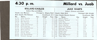 As many people hoped, Juab High School became the State Wrestling Champs in the 3-A Division. We now turn our attention to the basketball team who are geared up for the Class A Tournament. The Juab Wasps are ready to take on the Millard Eagles on Thursday at 4:30 on March 4, 1971. Juab has Brent Anderson who is averaging 19 points a game, then in comes Kevin Stanley with 15 points a game. If you didn't get your program, we will share ours.